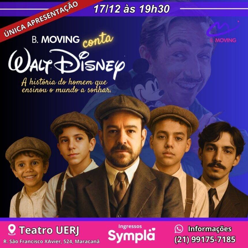 A B.Moving leva ao palco do Teatro da UERJ, no dia 17 de dezembro, às 19h30, uma de suas maiores produções: “B.MOVING Conta Walt Disney – A história do homem que ensinou o mundo a sonhar”. O espetáculo celebra a trajetória do criador que revolucionou o entretenimento mundial e transformou a imaginação em legado cultural.