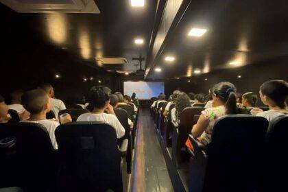 (Cinema itinerante tem piso inclinado, poltronas confortáveis e tecnologia de ponta. Foto:…
