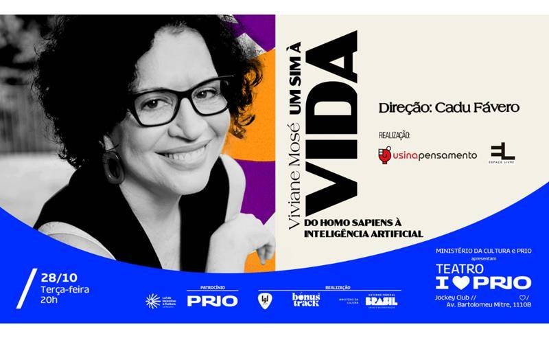 A psicóloga, poeta e filósofa Viviane Mosé, leva para o Teatro I Love PRIO o monólogo poético filosófico “Um sim à vida – Do Homo Sapiens à Inteligência Artificial”. A apresentação única acontece no dia 28 de outubro, terça-feira, às 20h – Ingressos disponíveis. Com direção de Cadu Fávero, em uma encenação que utiliza o corpo, gestos, dança e imagens projetadas de modo a criar um ambiente que estimule o estado estético, onde os sentidos ressaltados nos ampliam a potência de vida.